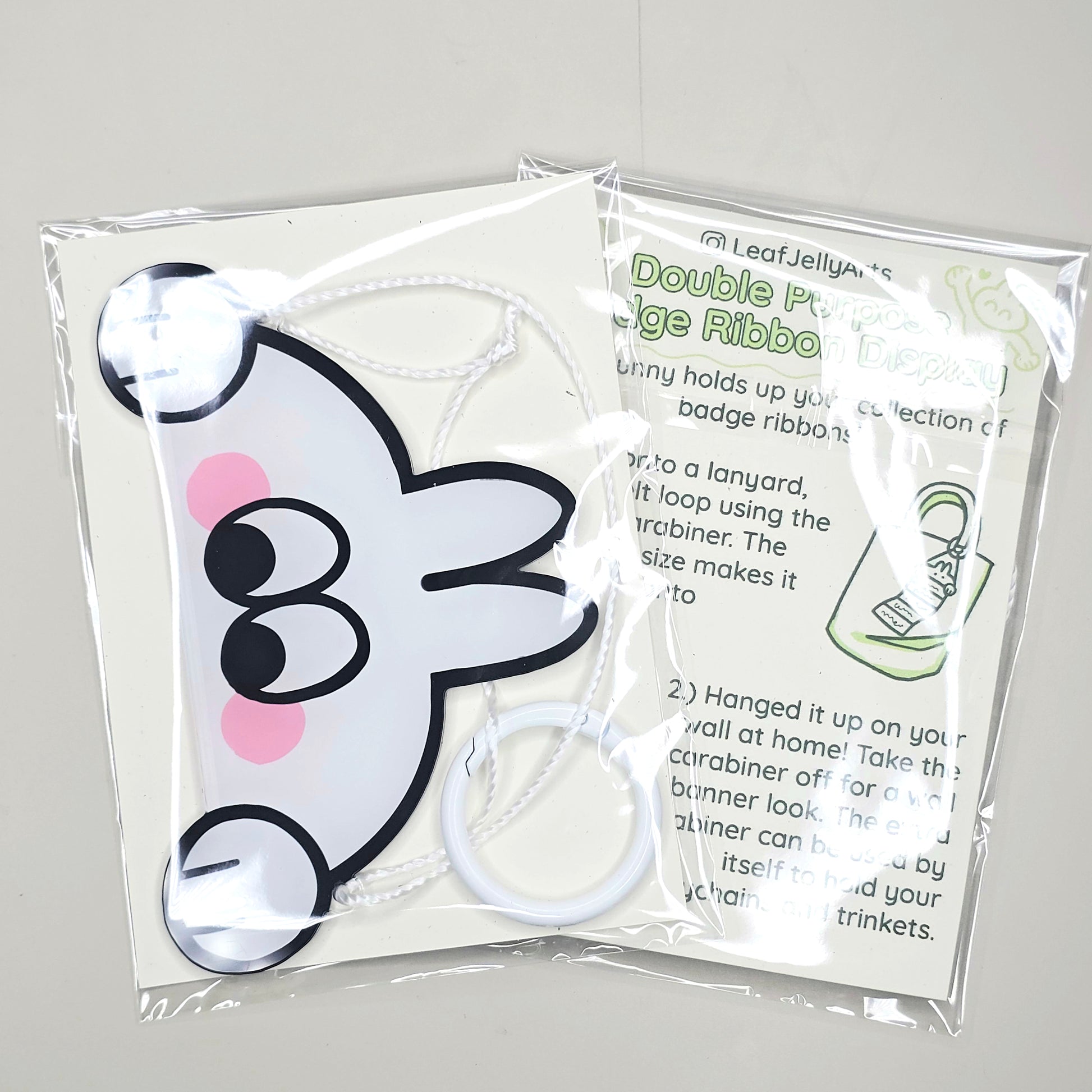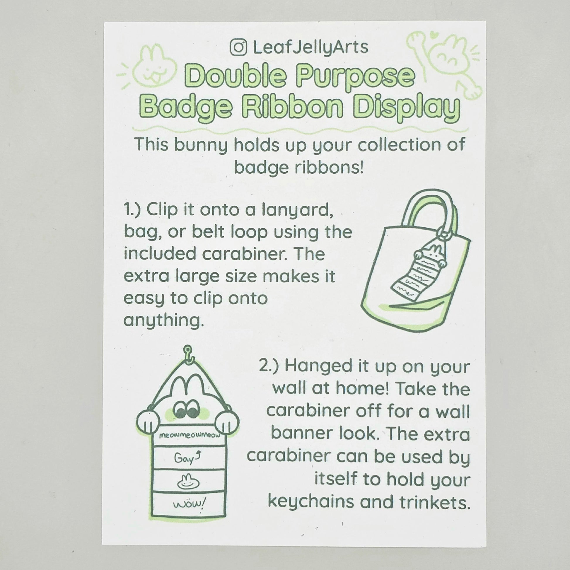 This bunny holds up your collection of badge ribbons! It's made to hold 4in wide ribbons. It comes with a removable large carabiner.