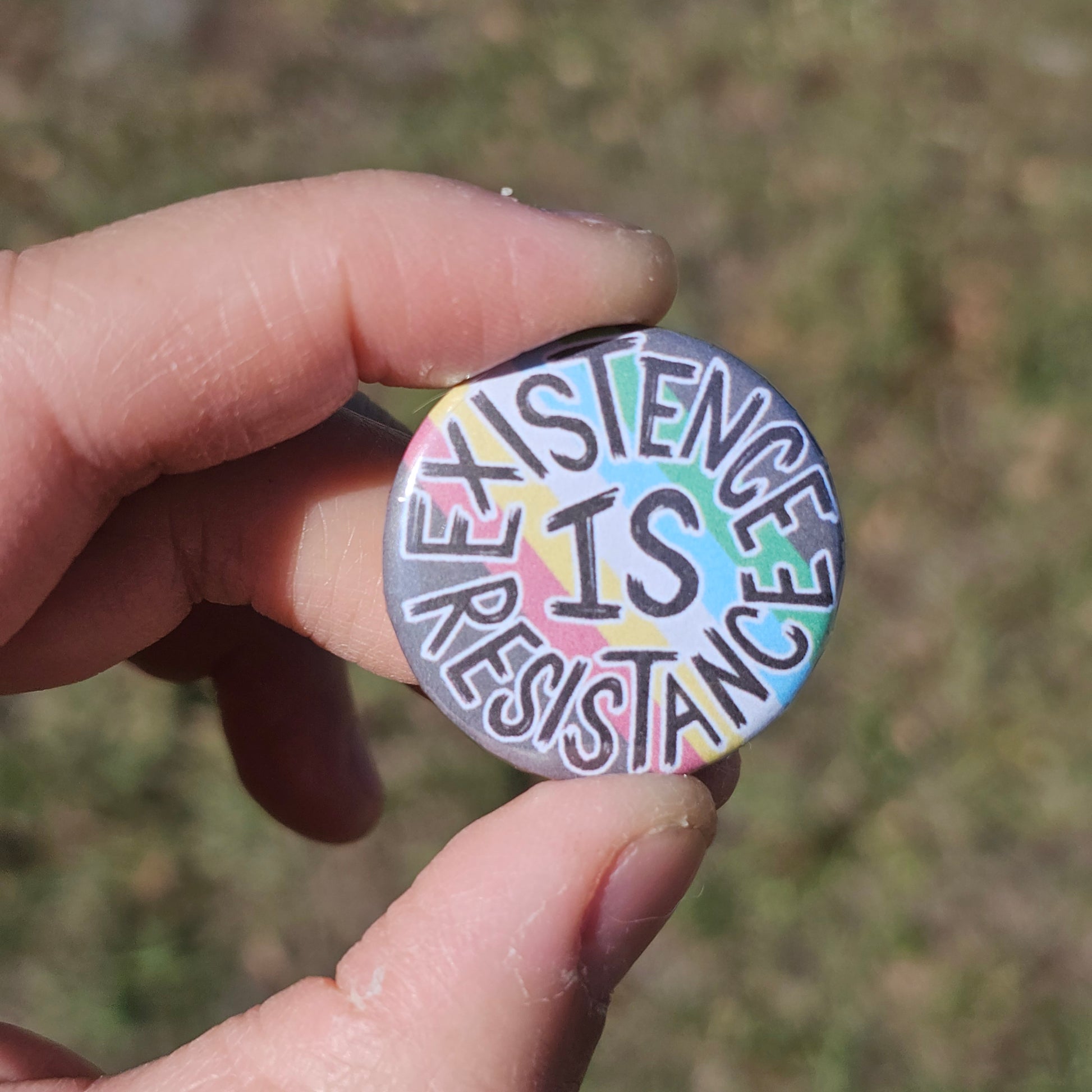 This is a small 1.2in button pins that says EXISTENCE IS RESISTANCE with the trans or disability pride flag colors! When you buy this pin you are supporting a disabled trans artist 💚