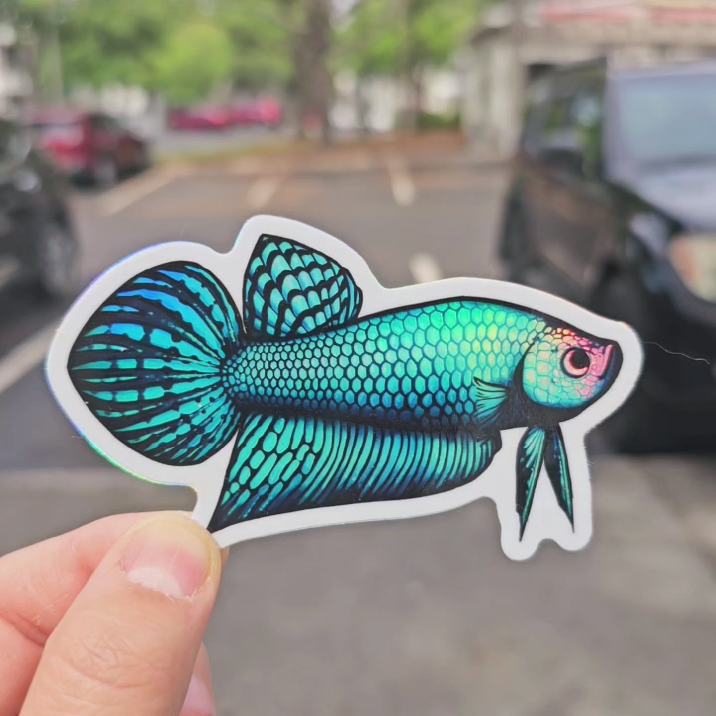 A holographic glossy sticker of an Alien Betta fish! The real fish has a metallic sheen, so a holographic effect is fitting for these beautiful little fish.