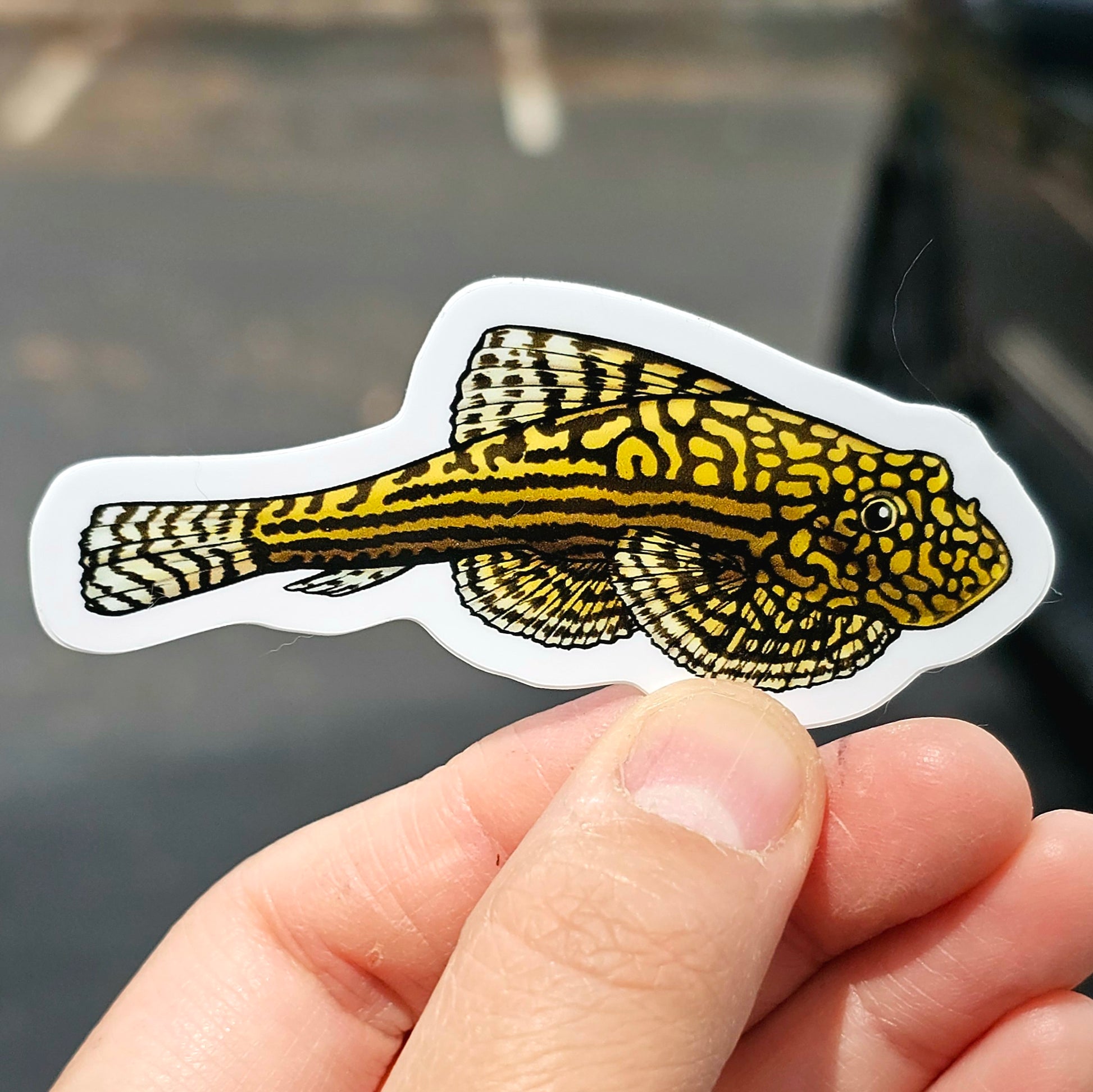 This is a realistic sticker of a Reticulated Hillstream Loach. The sticker has a glossy smooth finish.