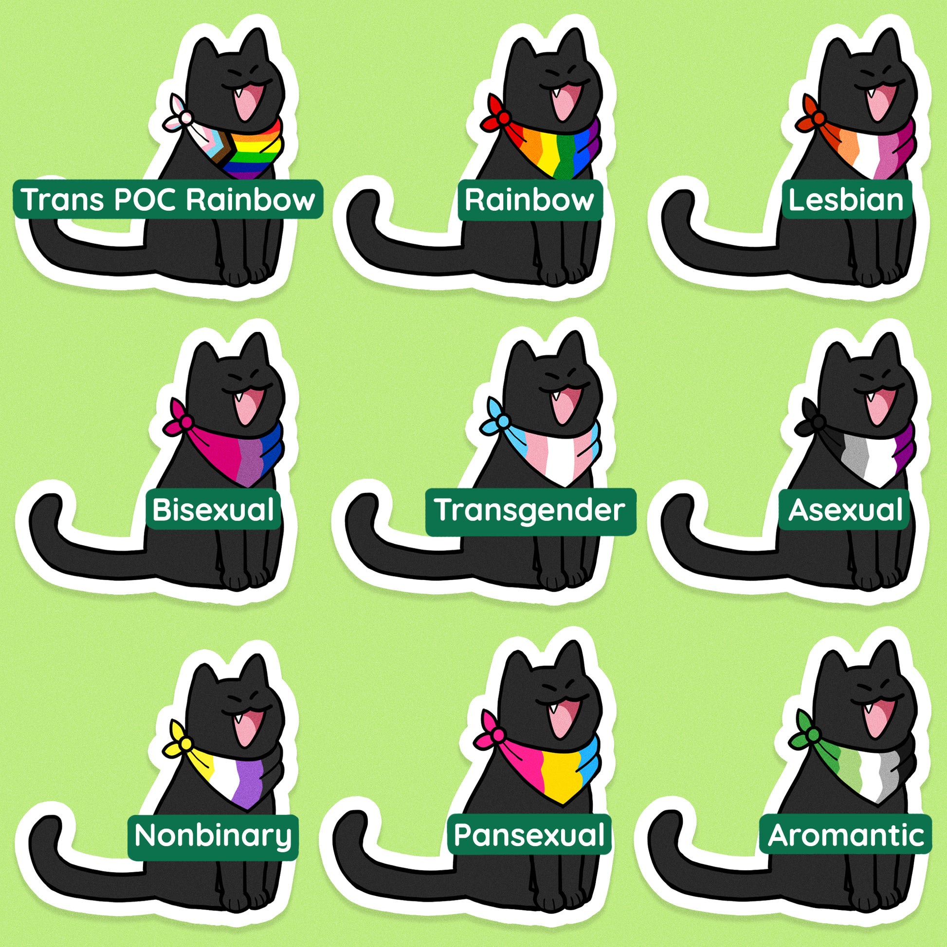 This is a 3in tall sticker of a black cat wearing a bandana of various pride flags.