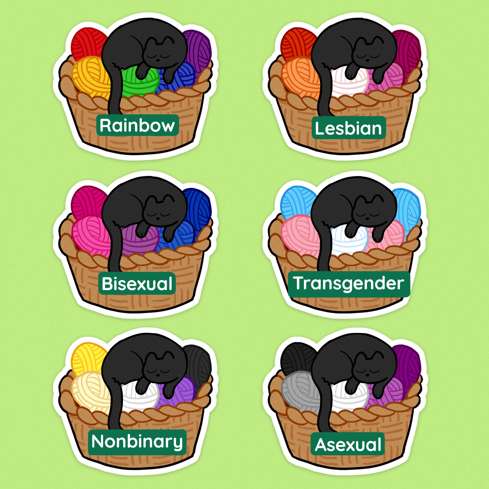 Black cats sleeping on a basket of pride colored yarn. A subtle pride sticker with various pride flag colors :)